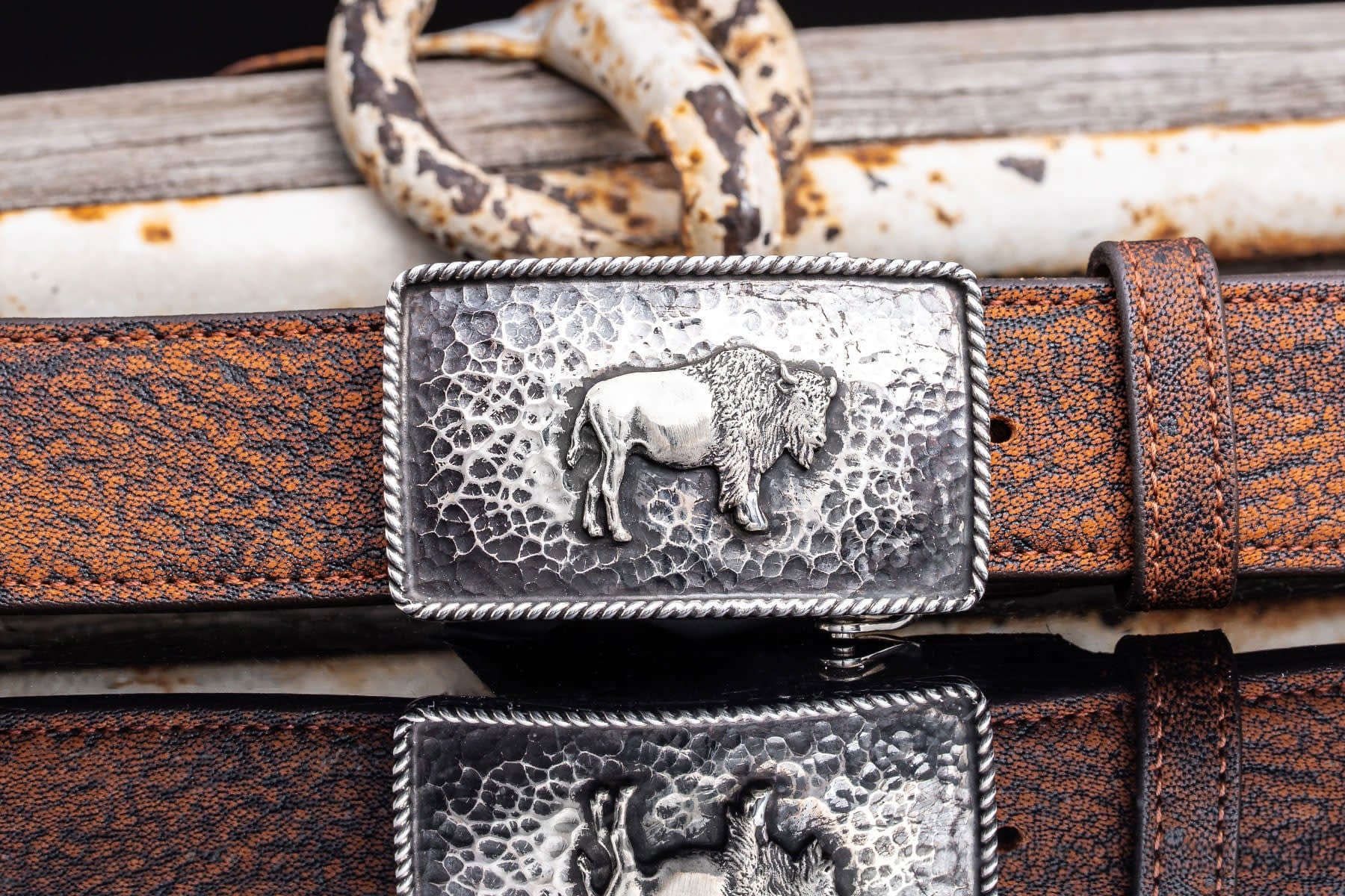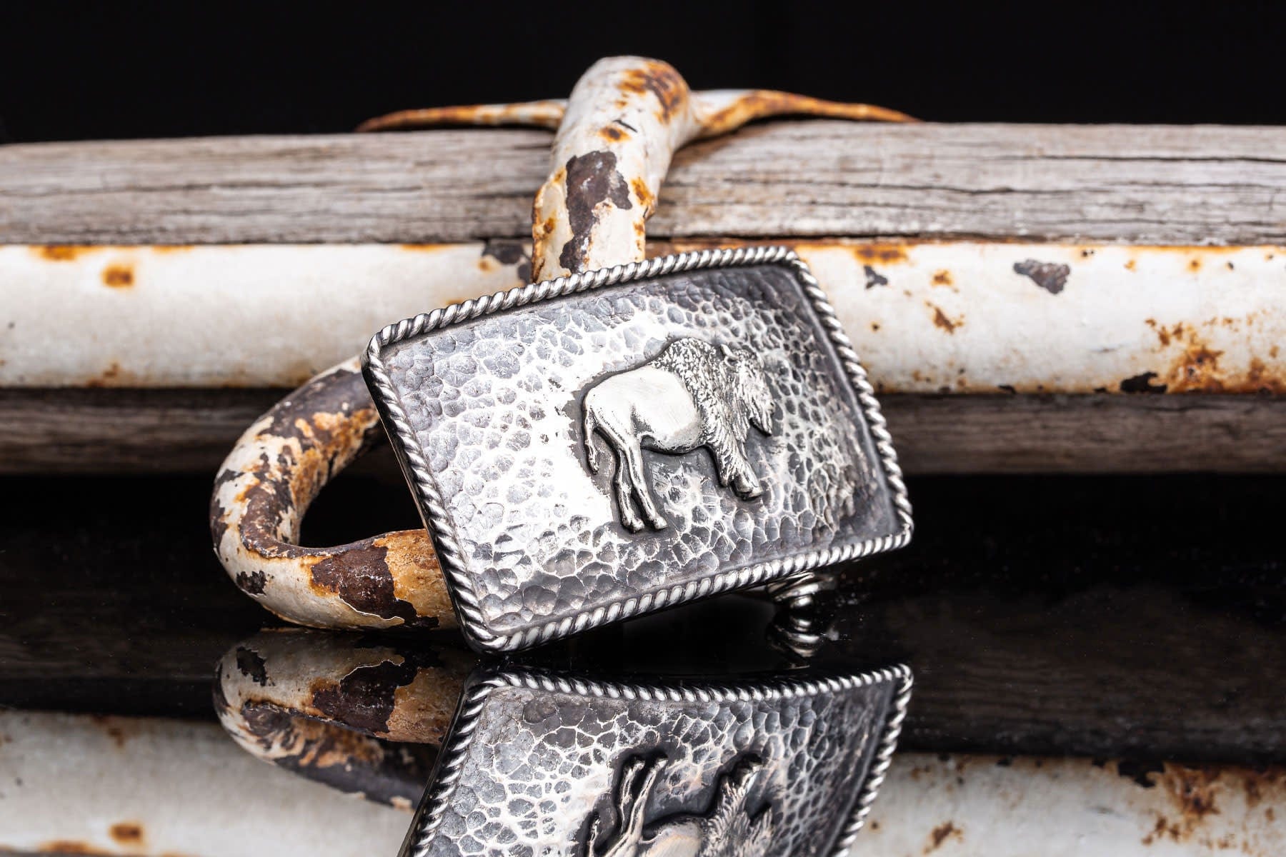 The Green River Buffalo buckle embodies strength, heritage, and craftsmanship. Set on a compact Mason bridge shape, this handcrafted piece features a bold buffalo figure standing against a richly hammered sterling silver background. A twisted wire border frames the buckle, adding a refined Western touch. Designed to fit all 1.5" belt straps, it offers a balanced blend of rustic grit and artisanal sophistication. Made in the USA, this piece honors tradition while standing out with timeless character.