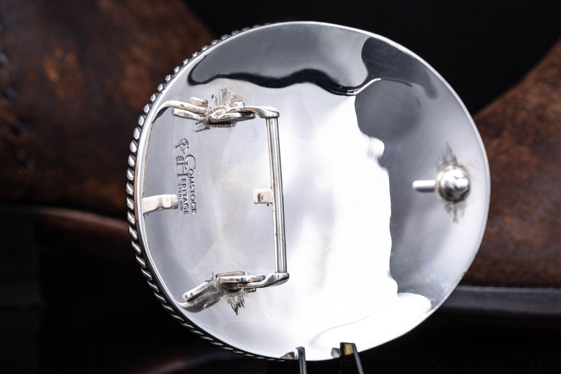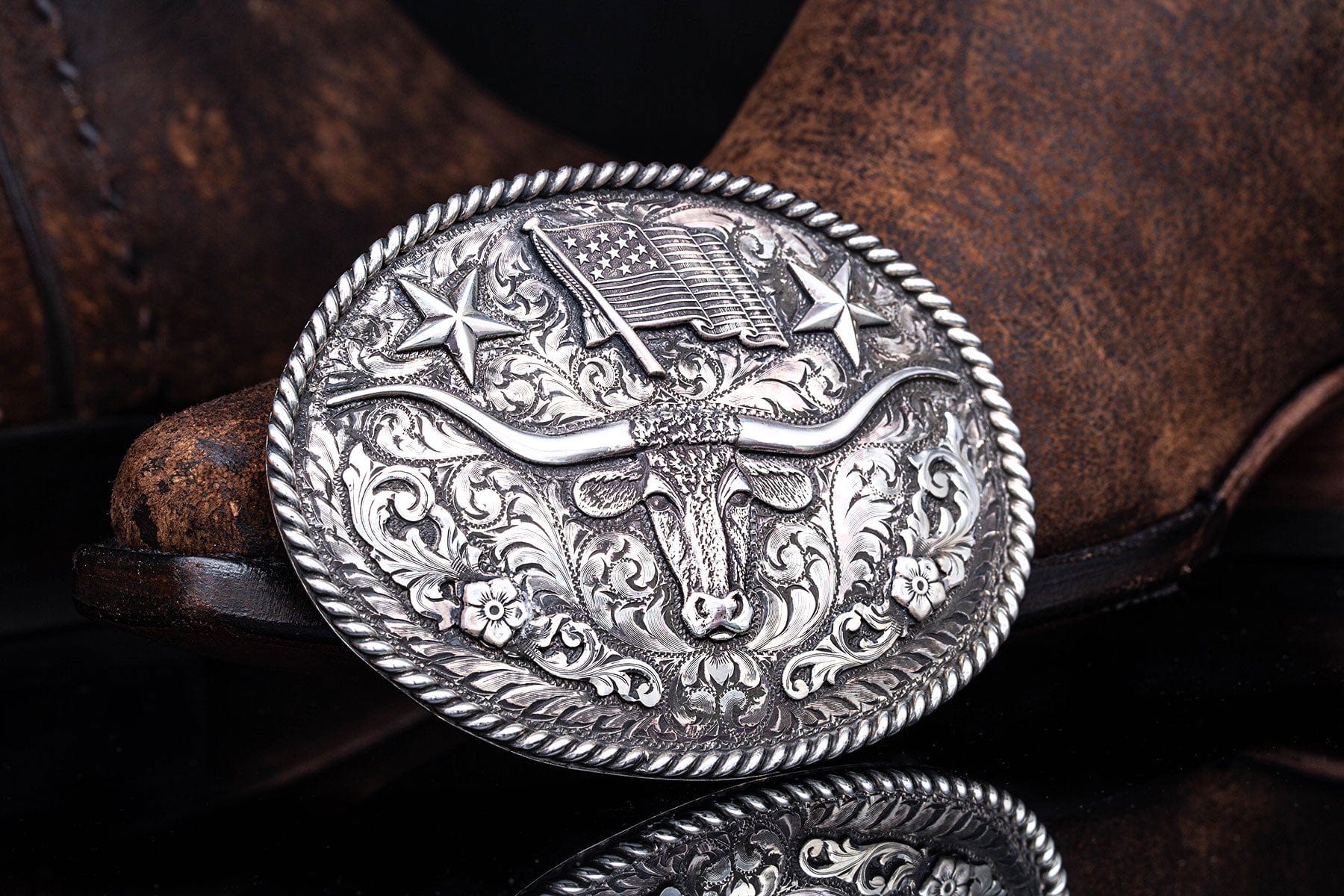 This impressive large oval buckle, crafted in sterling silver, embodies the spirit of the American Rodeo. It features a striking heavy rope edge and intricate floral overlays at the bottom, beneath a prominent sterling silver longhorn centerpiece. Above the longhorn, two star figures flank a meticulously detailed sterling silver American Flag. The entire buckle is adorned with hand engraving, showcasing masterful artistry. Measuring 3.52" x 4.59", this buckle can be paired with a 1.5" belt strap. Handmade in Nevada, USA, it is a testament to exceptional craftsmanship and elegance. The buckle includes a custom hinged bail, ensuring a perfect fit for any 1.5" belt strap.