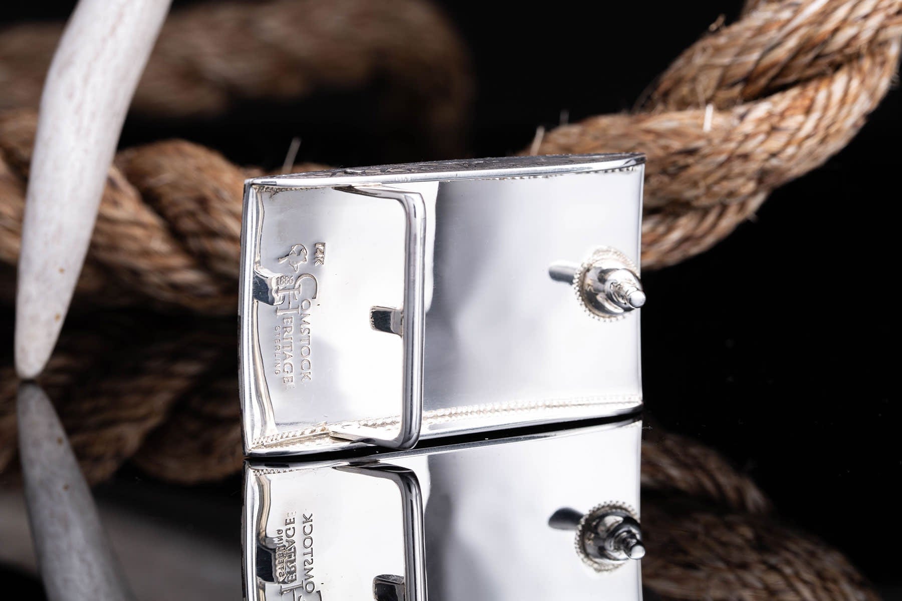 The Tyson Swirl Multi 14K is a sterling silver military-style buckle, measuring 2 7/8" x 1 1/2", with intricate hand engraving on both the front and back, as well as on the sides. This unique buckle features a blend of 14k yellow, green, and red gold overlays, creating a stunning swirl pattern. The moveable bale allows the belt to self-level, ensuring the buckle remains flat. Handmade in the USA, this buckle exemplifies exceptional craftsmanship and meticulous attention to detail, making it a standout piece for any collection. Designed to fit 1 1/4" belt straps.
