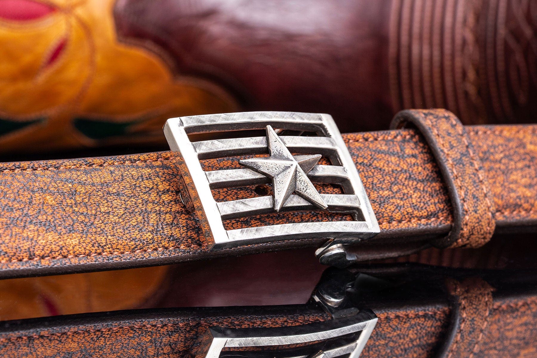 The Corey Buckle features a bold sterling silver star set against a sleek, polished frame—simple, striking, and distinctly American. Designed with a hinged bail for easy wear, it fits a 1.25" (30mm) belt strap. Measuring 2" x 1.5", it offers a refined profile that pairs effortlessly with both casual and dress belts. Made in the USA with craftsmanship that stands the test of time.