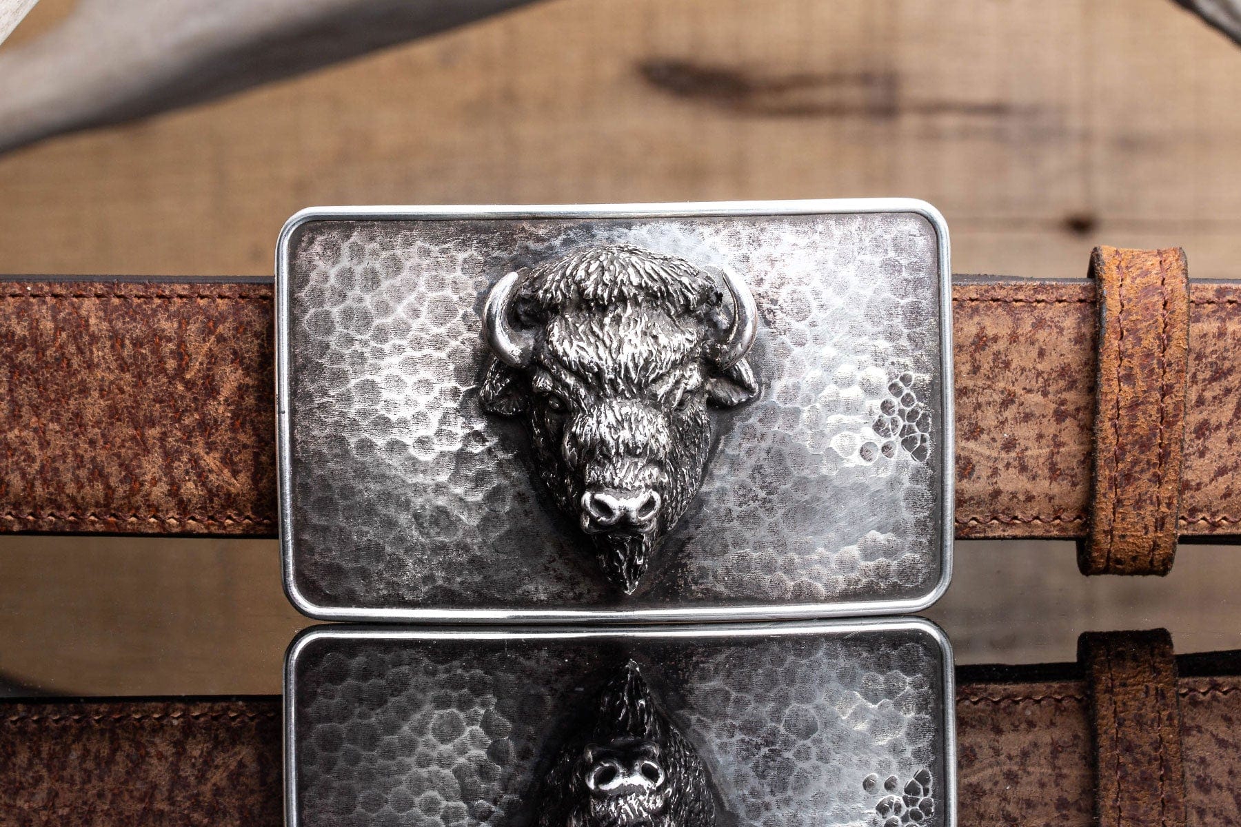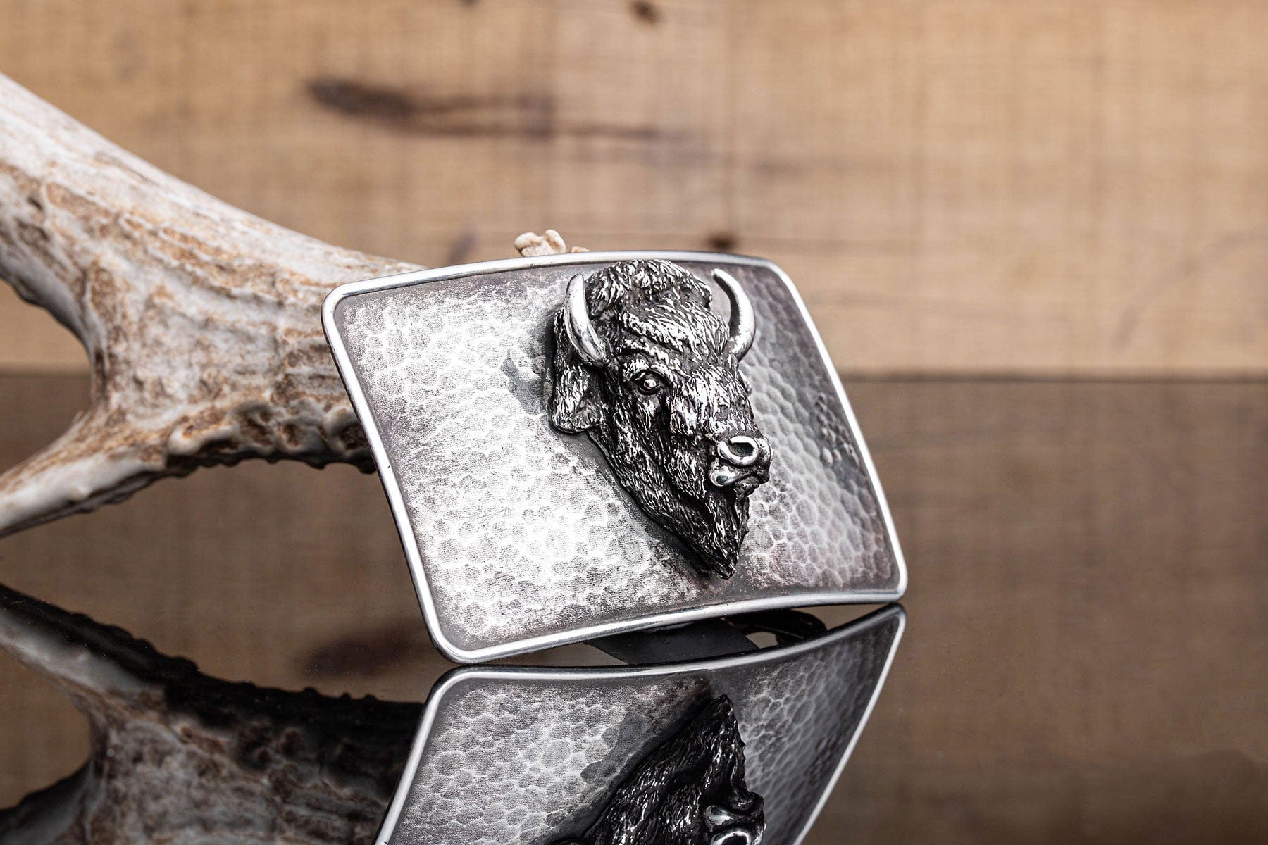 The Mason Bridge XL Buffalo is a sterling silver trophy-style buckle with a strong and intricate design. A wire edge frames the inlaid hand-engraved finish, enhancing its detail and dimension. At its center, a hand-cast sterling silver buffalo stands as the focal point, giving this buckle a unique and rugged character.