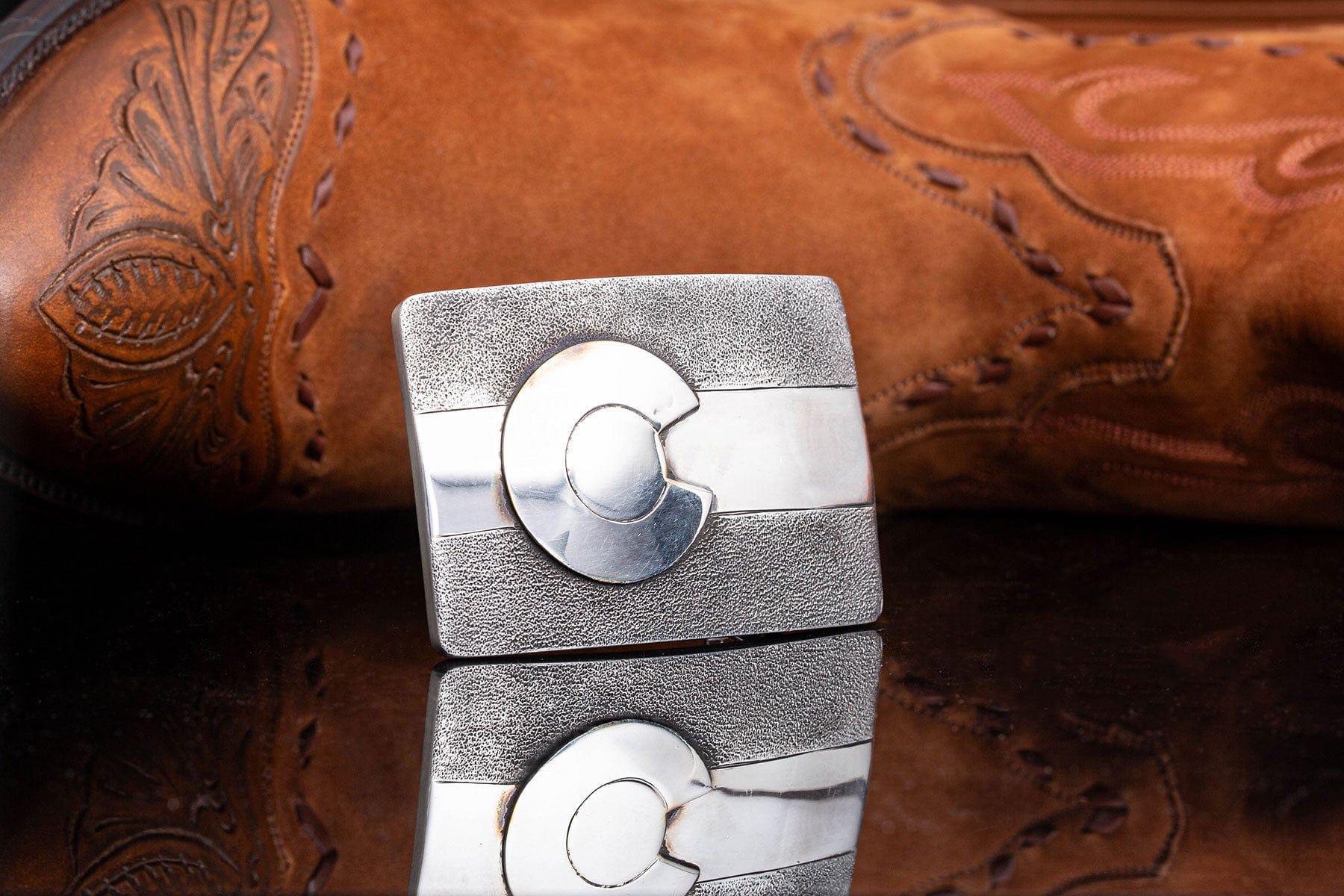 The Mason Centennial Buckle features a striking centerpiece of the Colorado state flag. This elegant design is set on a handmade sterling silver base, with expert antiquing that lends an appropriately vintage vibe to this Centennial State tribute. Measuring 2 7/8" x 1 7/8", it fits all 1.5" belt straps. Handmade in the USA, this buckle exemplifies exceptional craftsmanship and meticulous attention to detail.