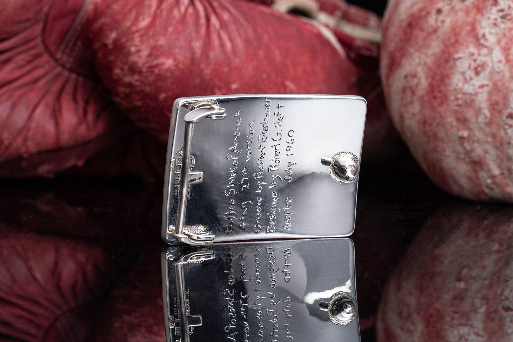 The Mason US Flag Trophy Buckle is a robust, heavy gauge "Mason" shape buckle, adorned with meticulously cut sterling silver strips and corner pieces to create a striking sterling silver American Flag design. Handmade in Nevada, USA, this buckle exemplifies exceptional craftsmanship and elegance. Measuring 3" x 2", it includes a custom hinged bail, ensuring a perfect fit for any 1.5" belt strap, making it both a patriotic and stylish accessory.