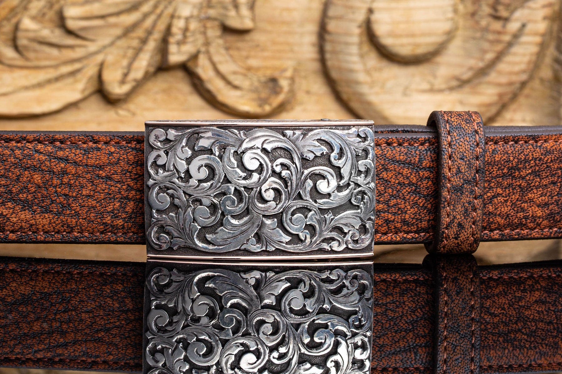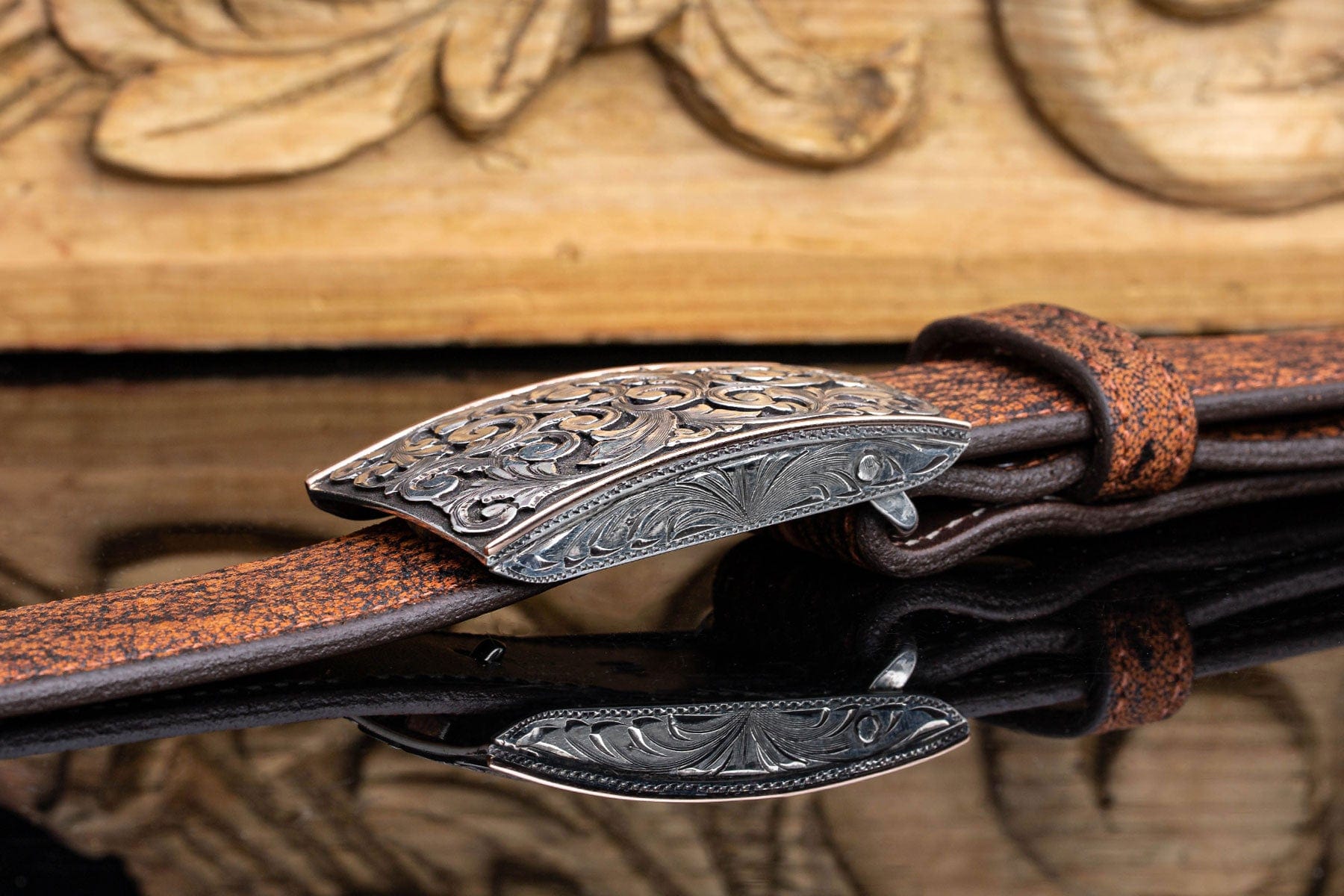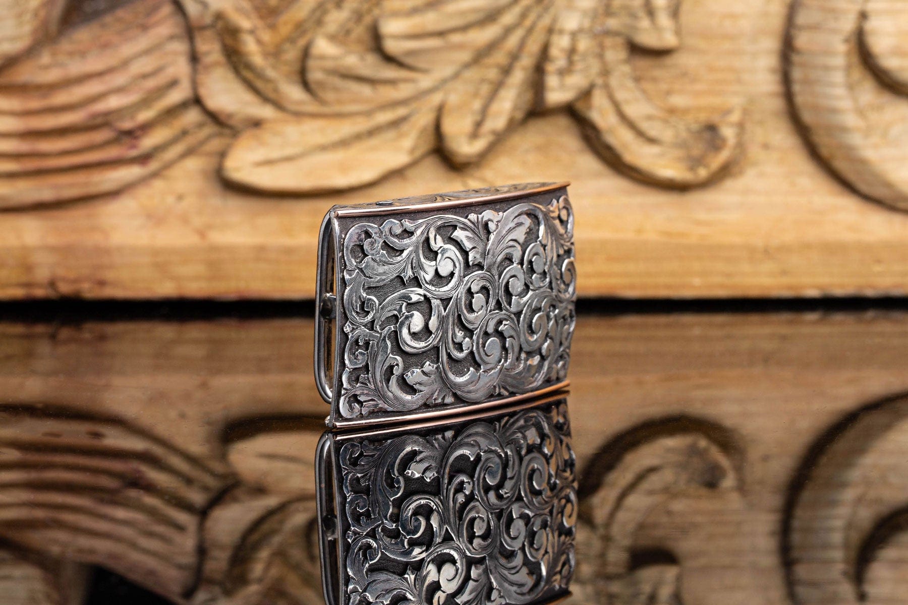 • Sterling silver "Tyson" buckle base hand-carved filigree in the center and a piece of 14k gold wire to the top and bottom