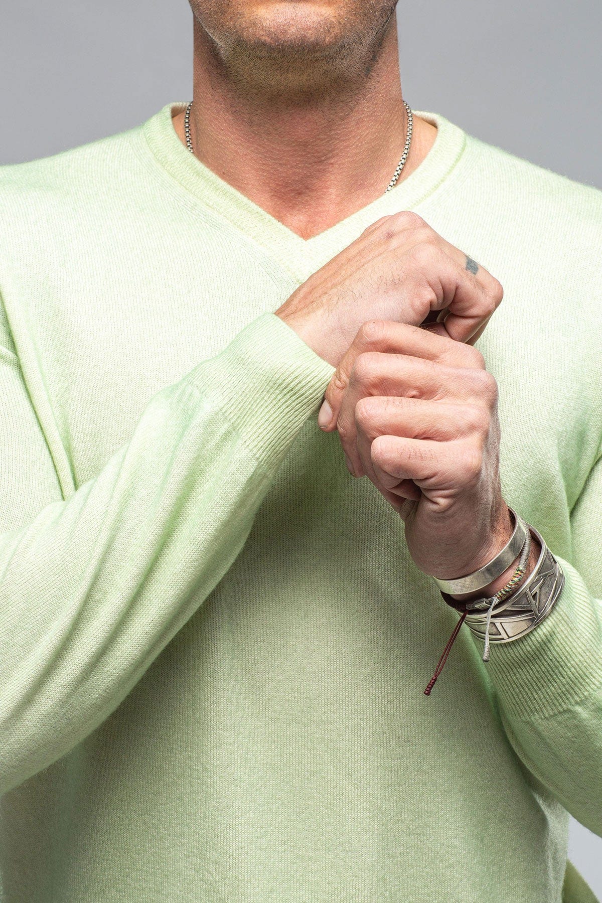 This V-neck men's sweater is crafted from plain knitted Kid Cashmere; an extremely fine and soft fiber, obtained exclusively from the undercoat of the Hircus goat kids. Its precious and exclusive yarn makes this style the luxury version of an essential knitwear item- in other words, if you know, you know...